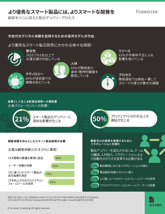 2021年7月27日、The Qt Company(本社:フィンランド エスポー、日本オフィス:東京都千代田区)の委託によりフォレスター社が実施したグローバル調査の結果を発表しました。この調査では、世界的な半導体の不足や開発者のスキルギャップ、コネクテッドデバイスの需要急増によって、80%以上のメーカーがデジタル製品の製造やサービス提供に課題を抱えていることが明らかになりました。