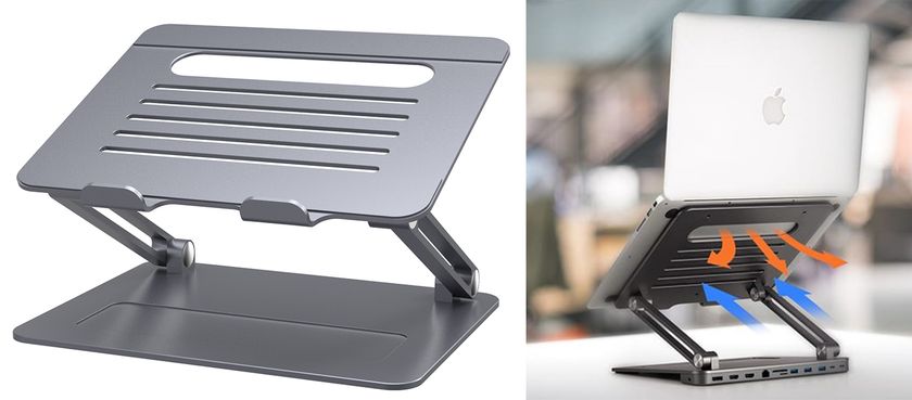 スタンドのクレードル部分に空気循環のための通気孔を設け、ノートPCの過熱を防止する設計になっています。