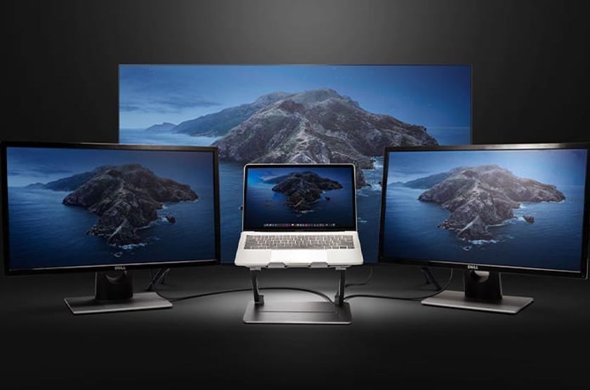 【Z HUB Pro】ではWindowsの場合メインのノートPCを加え最大4画面でのマルチモニター環境を手軽に構築可能。作業の更なる効率化を実現します。※Macはモデルによって画面拡張可能数が異なります。