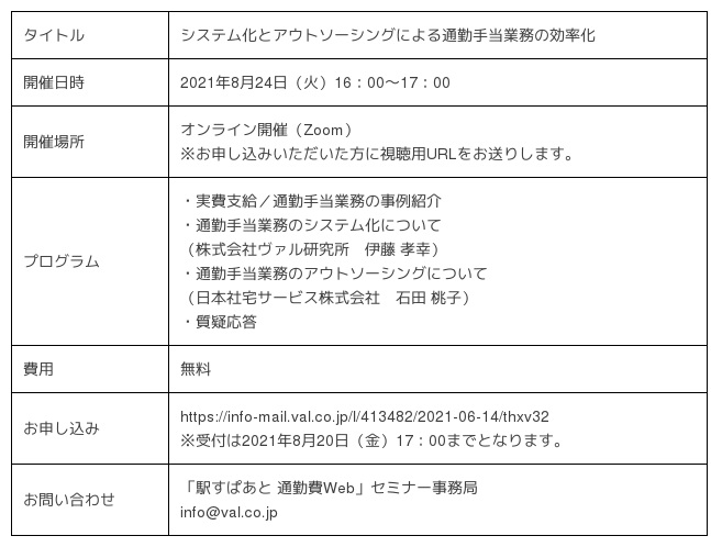 経路検索サービス「駅すぱあと」を提供する株式会社ヴァル研究所(本社:東京都杉並区、代表取締役:菊池 宗史)は2021年8月24日(火)、在宅勤務と出社勤務の併用にともなう通勤手当の混在や管理の煩雑化などに課題を持つ人事・総務向けに、通勤手当業務のシステム化とアウトソーシングの活用法を紹介するWebセミナーを、日本社宅サービス株式会社と共同で開催します。