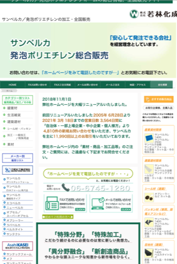 サンペルカや発泡ポリエチレンを販売する、株式会社若林化成(本社:大阪府東大阪市稲田上町、代表取締役:若林 正蔵)が運営するホームページが、11月に再リニューアル4年目を迎える。