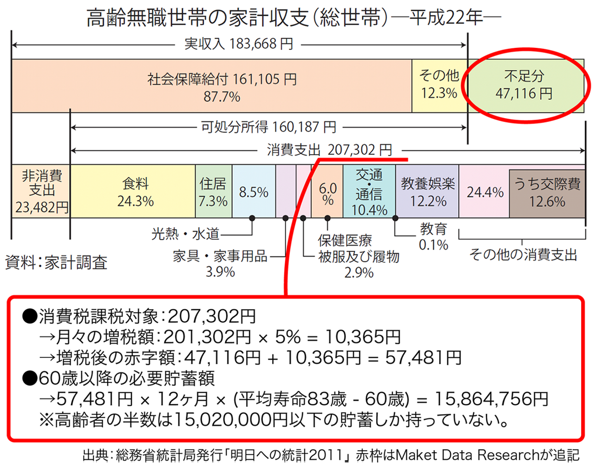 総務省の明日への統計2011( http://www.stat.go.jp/info/guide/asu/2011/index.htm )によると高齢者世帯収支は一月あたり47,116円の赤字であり、消費税が10%になると、この赤字額は57,481円に増えます。つまり60歳から平均寿命である83歳まで生活するためには平均1,586万円の蓄えが必要とされる計算になるのです。