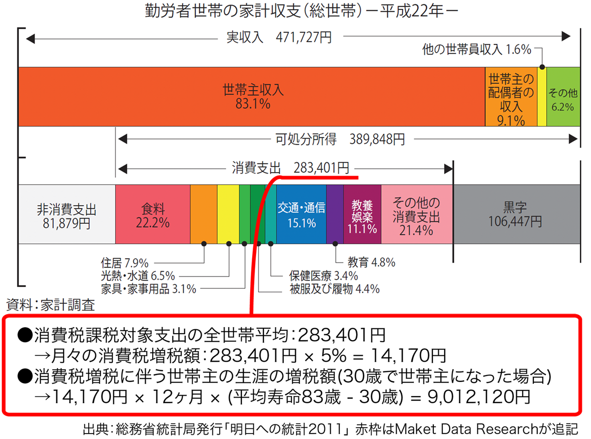 また、同資料の家計支出統計によると、消費支出の全世帯平均は283,401円となっています。消費税が5%増加するということは毎月これの5%の金額が新たに課税されるということで、計算してみるとこの金額は月々14,170円、一年間では170,040円となります。30歳で世帯主になったとすると、そこから83歳まで毎年この金額を払い続ける必要があるのです。その間実に53年、金額にして9,012,120円にもなります。