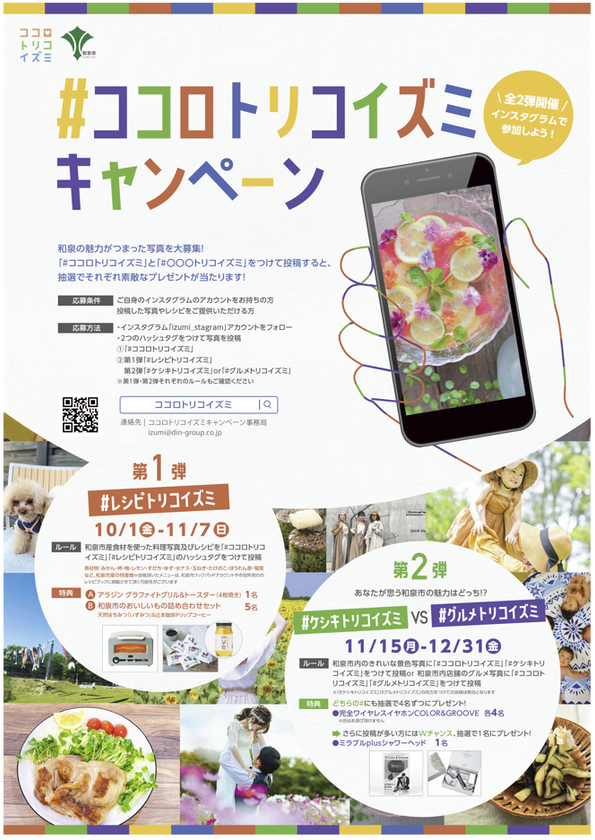 大阪府和泉市は、#ココロトリコイズミキャンペーン 第一弾を2021年10月1日(金)〜11月7日(日)にInstagramで実施します。和泉市の食材を使用したレシピ画像に「#ココロトリコイズミ」と「#レシピトリコイズミ」をつけて投稿すると、抽選でおうち時間を充実させる素敵な賞品をプレゼントいたします。