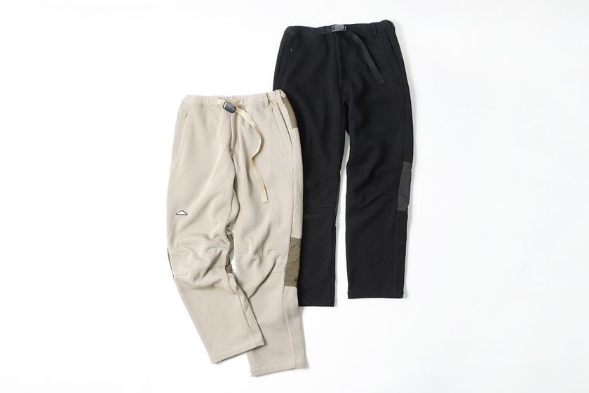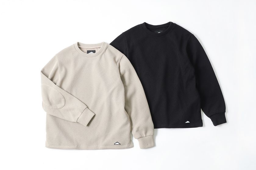 表8G・裏32Gの異なるゲージで編み上げた通称クオーターニットと呼ばれる素材は独特の見た目。軽量で伸縮性があり快適なだけでなく、生地の中に空気の層を含むため保温力に長け、撥水性も高いため雨にぬれたり洗濯しても乾きやすく、着用時は温かい。クルーネックセーターにはサイドポケットを搭載。パンツの膝は立体構造で動きやすく、フロントも着脱がしやすい設計です。