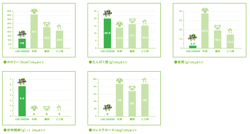 日々不足するタンパク質、食物繊維がうれしいうえに、お肉と比べてカロリーや脂質はしっかりカット。からだに安心のコレステロールフリー。毎日食べても飽きない、そのヒミツは栄養バランスにも隠されています。LIKE CHICKEN!?なら、揚げ物にしても脂質・コレステロールを抑えられ、食物繊維もUP。健康を気づかうすべての方々に寄りそう、新しい食の選択肢です。
