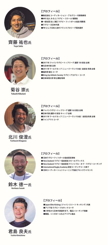上記講師陣に加えて、ジャパンラグビーリーグワン所属チームの東芝ブレイブルーパス東京・東京サントリーサンゴリアス(11月14日)、リコーブラックラムズ東京(11月20日)、日野レッドドルフィンズ(12月4日)の協力を得て実施いたします。