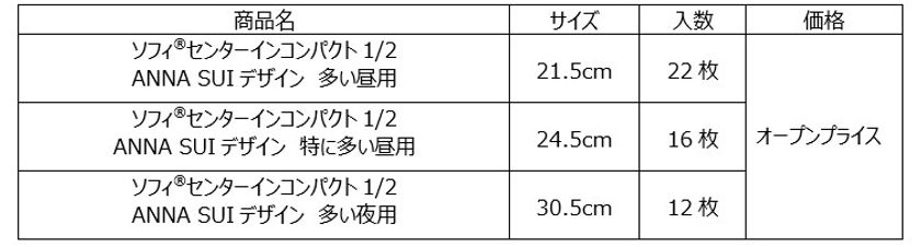そこでこの度、ご好評にお応えして、新しい「ANNA SUI」のデザインを採用した『ソフィ(R)センターインコンパクト1/2』を、2021年11月2日に全国で限定発売します。