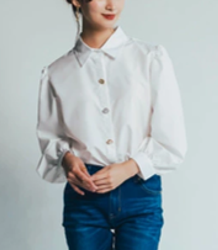 内田理央も塩野瑛久も注目!「シンプルだけど素敵♪」異なるデザインのビジューボタンがお洒落なランタンスリーブシャツ!TOKYO FM「Qoo10 presents 内田理央の明日、なに着よ?」