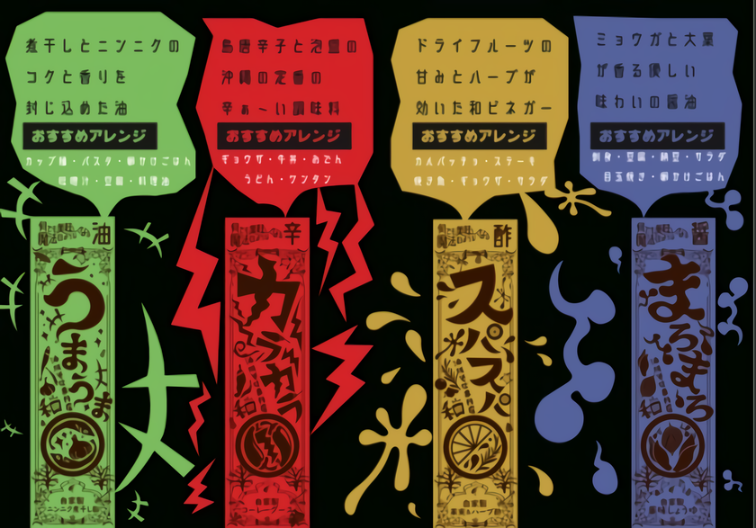 など全く新しい調味料となっております。これらはサラダや炒め物、納豆や餃子、カレーなどのいつもの食卓の味変にも使えます。