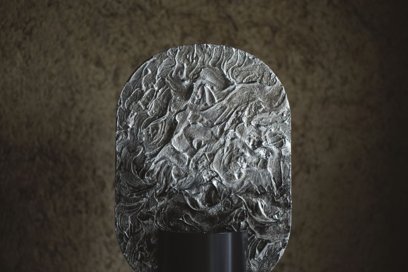 シェードは裕人 礫翔氏が一つひとつ手作業で仕上げています。同じ模様は二つとありません。24金(金99.9%)の金箔またはプラチナ箔を貼っており、表面は月面のような凹凸を、裏面には流線型の模様を描いています。土台は遠藤 道明氏がシェードに合うよう一からデザインを起こし、心が和んで落ち着く光に仕上がっています。