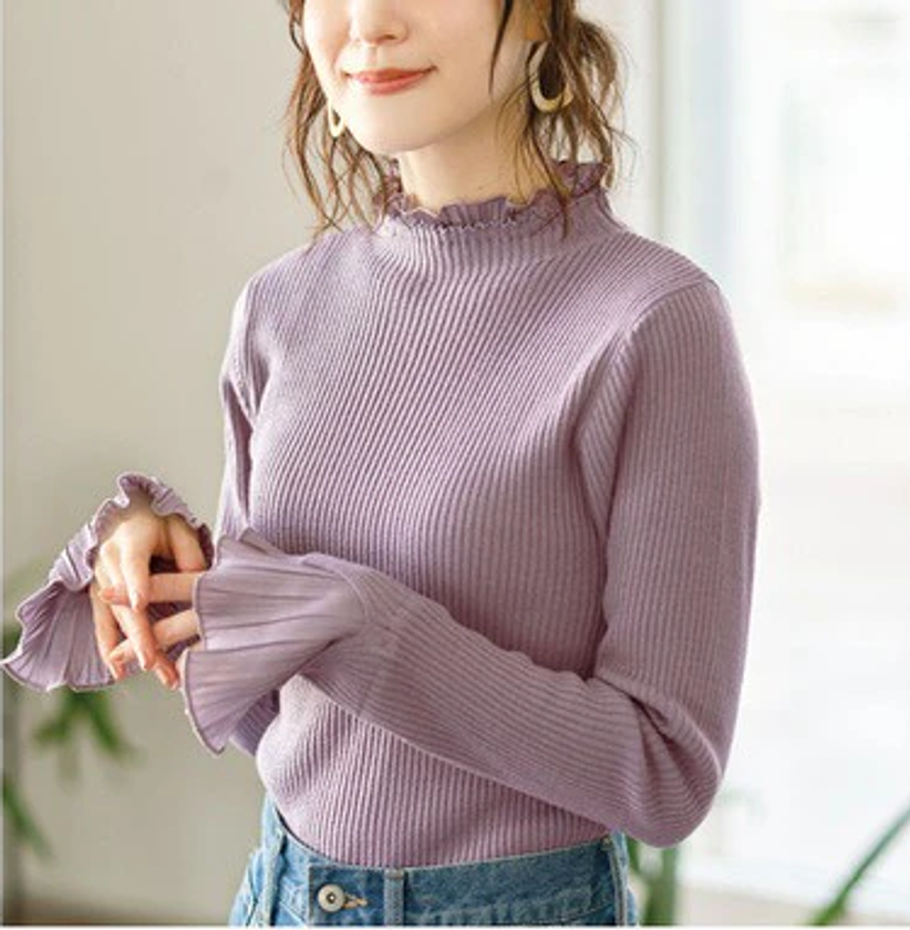 長めのフレアプリーツデザインの袖口が大人可愛いリブニット素材のトップス。柔らかく着心地の良い生地は伸縮性があり、程よく体のラインにフィットします。S〜5Lまでの幅広いサイズ展開は、ジャストサイズでキレイめコーデや重ね着スタイルでも、或いはいつもよりオーバーサイズでカジュアルに着こなしても、それぞれ異なる表情を楽しめそうです。衿は、ハイネックの他にVネックとクルーネックタイプがあり、豊富なカラー展開と共にその日の気分やコーデに合わせて選ぶ楽しさも。