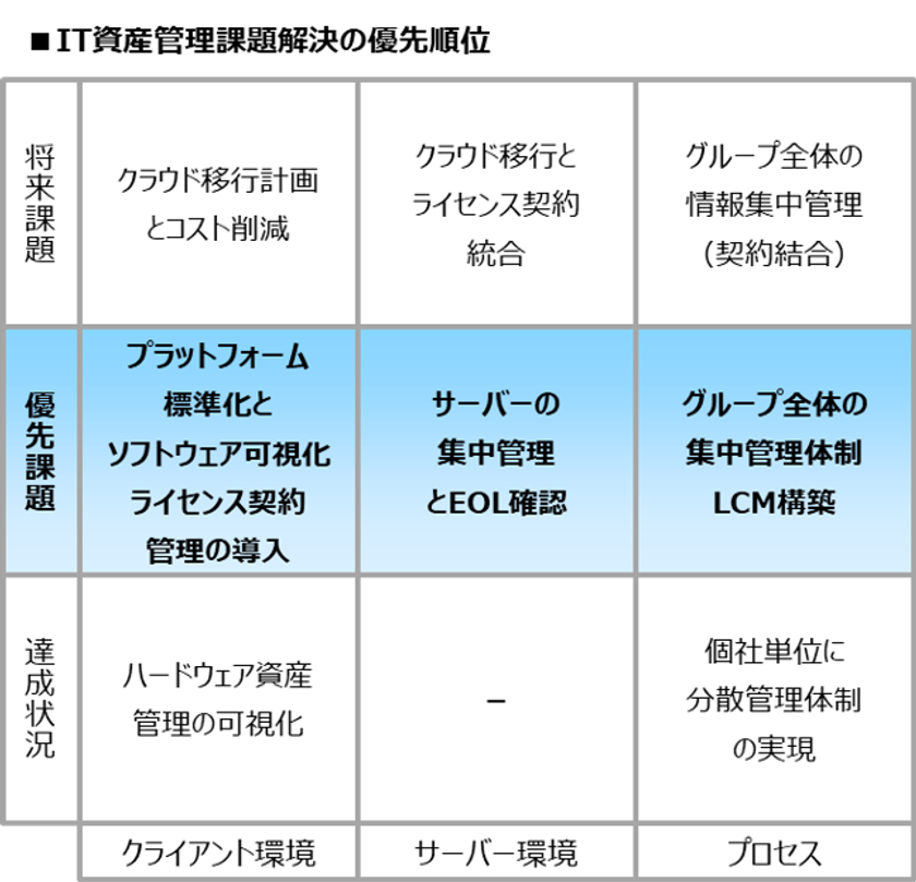 こうしてIT資産資源の全量可視化ができた上で、IT総コストTCOを「システム別に、経年で把握」するシステム・ライフコスト管理を志向したり、エンドユーザー一人一人の端末アクセス、使用アプリケーション、作業環境などのログ情報を分析して、より一人一人に働きやすき、企業にとってはコスト効率の高いIT配置の調整なども検討課題にあがっています。