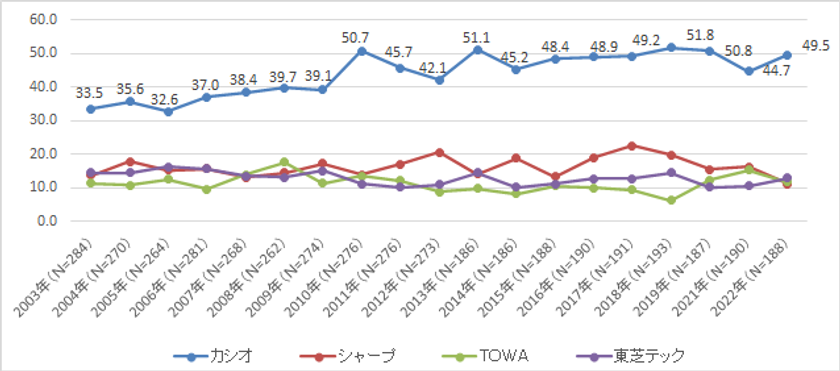 単独利用の電子レジスターは調査を開始した2003年以来、「カシオ」が19年連続でトップを維持しています。