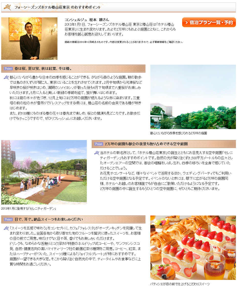 2013年1月1日よりホテルの名称が「ホテル椿山荘東京」に変更になります