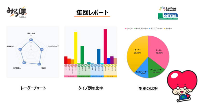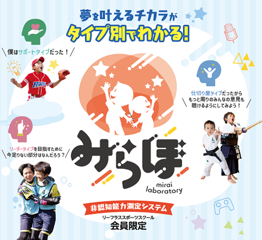 「みらぼ」とは、リーフラススポーツスクールが培ってきたノウハウを基に、九州産業大学(研究代表:磯貝 浩久)と「非認知能力(生きる力)」の測定尺度の開発に共同で取り組み、これまで感覚的な判断に頼っていた「非認知能力(生きる力)」を視える化できるシステムです。簡単な設問に回答することで、お子さまの「非認知能力(生きる力)」のタイプや高さが視て分かるシステムとなっています。