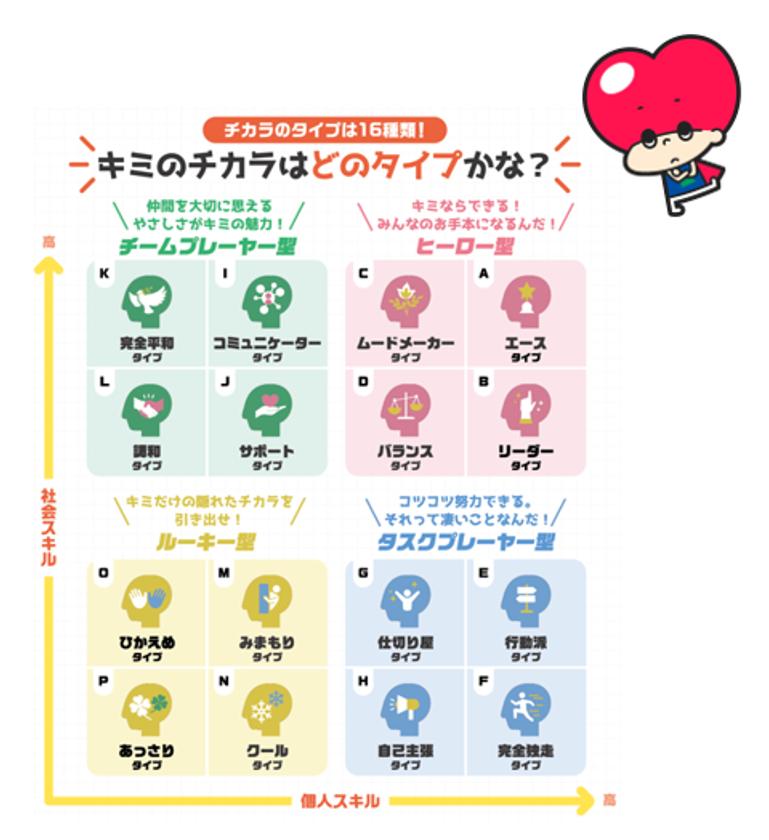 目で見て分かりやすい「4種類の型」から構成された「16種類のタイプ」で「非認知能力(生きる力)」のタイプが表示されます。自分の現在地のタイプを知り、今後の目標とするタイプを目指していきます。