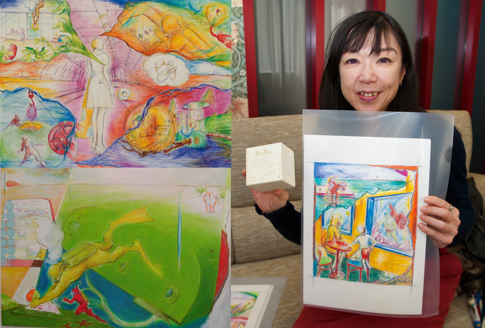 Yuki氏は、「コンテンポラリーアートは非常に難しいアート分野ですが、映画を見るような感覚で、描かれているストーリーを楽しんで欲しい」というメッセージを送っています。作品のテーマは水の中での生活。作品は、原色、明度の高い、強い色彩で描かれ、ダイバーが主人公となり、様々な風景が融合しています。一見、統一性がないようですが、眠っていた、もしくは忘れていた子どもの心と感覚が再び蘇る感覚に包まれます。