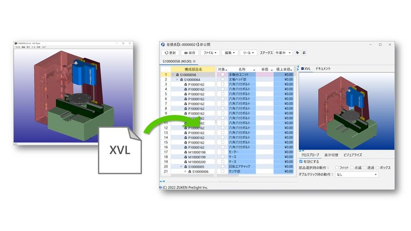 3D CADデータから変換したXVL(*2)を画面上にドラッグ&ドロップするだけで、3Dデータ付きの見積表を作成できます。エクセルなど、見積のためのファイルを別途作成する手間がなくなります。