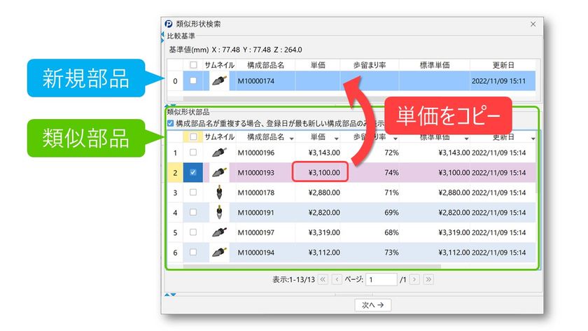 また、部品の3D形状をキーにして類似部品を検索する機能により、新規部品に類似した既存部品が見つかった場合、そのコストを新規部品の見積原価として採用することができます。本機能による見積手法の標準化を図ることで、担当者ごとの結果の違いが無くなり、組織全体の見積精度向上につながります。