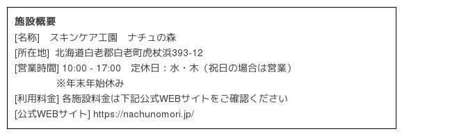「スキンケア工園 ナチュの森(以下、ナチュの森)」は、自社化粧品工場「ナチュラルファクトリー北海道」を中心に、化粧品原料を有機栽培する研究薬香草園や、子どもたちが自然の中で楽しむガーデンがある、工場の“工”とガーデンの“園”から成る“スキンケア工園”です。日本有数の透明度を誇る倶多楽湖の湧水を、美容と健康のために、化粧品づくりの原料としてはもちろん、ガーデンの運営やサロン、レストランにまで様々な方向から活用しています。