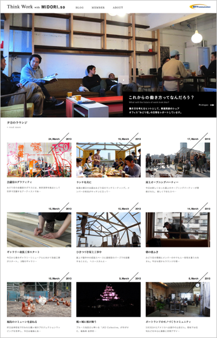 NTTコミュニケーションズ(略称:NTT Com)は、ノマドワーキングやシェアオフィス、コワーキングなど個人の働き方が多様化する中で、ICTを活用した新たな働き方を提案する「Think Work Project」を展開します。その一環として、様々な職種の事業家や活動家が集うワークスペース「みどり荘」(東京都目黒区)と協力し、NTT Comの各種ICTサービスを活用した「みどり荘」メンバーのリアルな活動を紹介する特設ブログサイト「Think Work with MIDORI.so」を、2013年3月29日に開設します。NTT Comでは、本サイトやソーシャルメディアなどを活用し、個人の新しい働き方や上手なICTの利用方法のヒントなどをお客さまに発信していきます。
