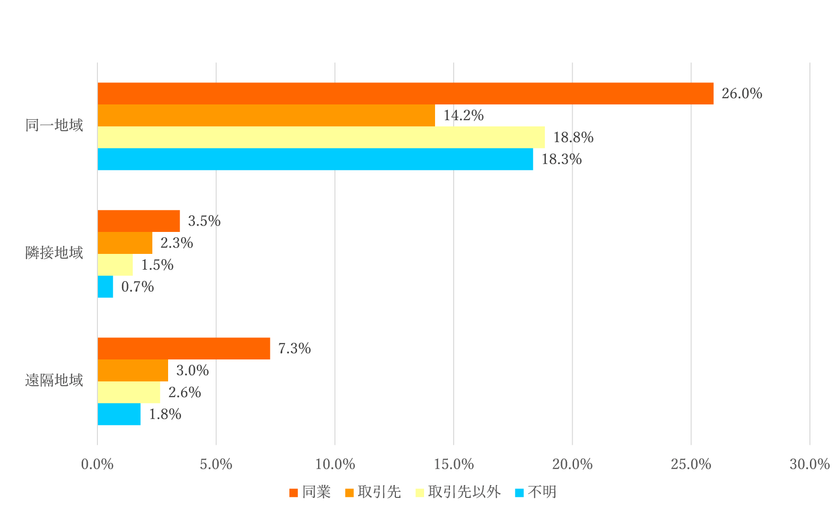 ◆(参考)中小企業庁が公表する「「事業継続力強化計画」認定事業者一覧(*ii)」を基に、地域/企業間連携BCPの連携相手の分析(*iii)を試みたところ、同一地域における同業種との連携が26.0%と最も多い。一方で隣接地域や遠隔地域における連携実施率は低く、特に取引先との連携はそれぞれ2.3%と3.0%に留まることが明らかに。【参考データ:図表A-10、図表A-11、図表A-12】(*)
