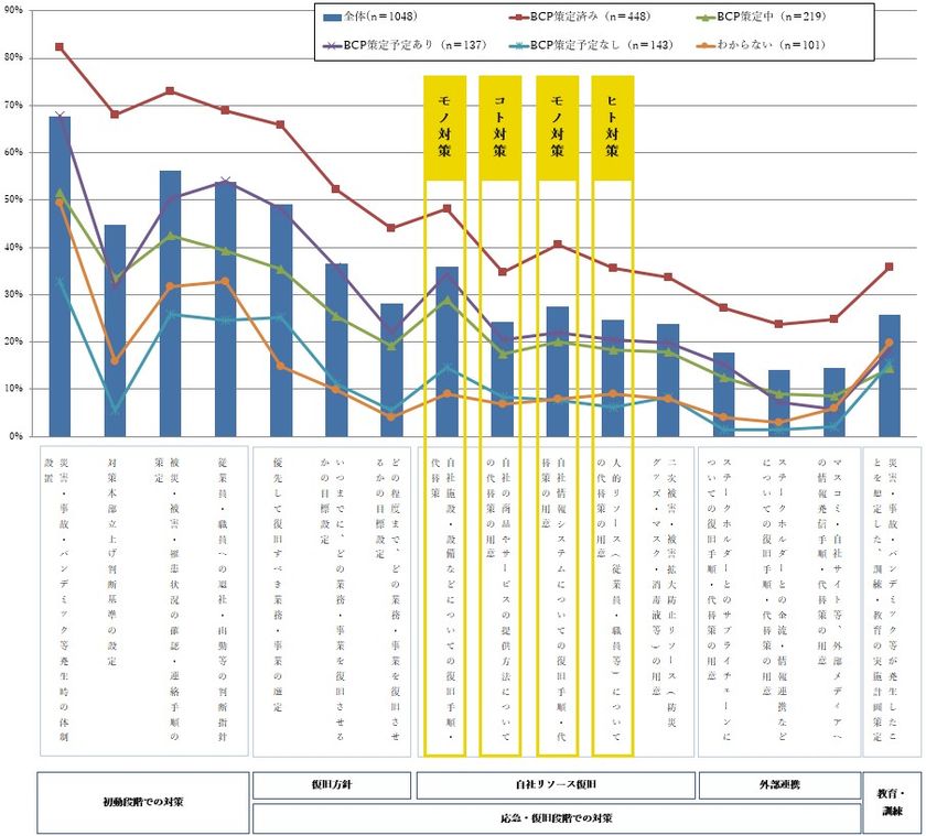 【図表A-3】今回調査時点の企業の事業継続に向けた取り組み(対策)別策定有無(n=1,048)<BCP策定状況別>