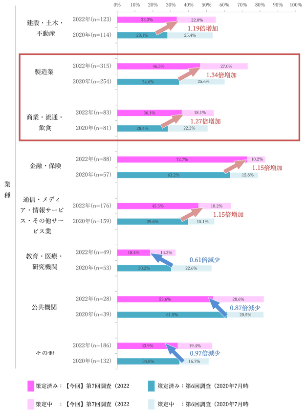 ◆前回調査と比較して製造業においてBCP策定率が1.34倍増加しており、最も高い結果に。製造業や商業・流通・飲食において、コロナ禍を経てサプライチェーンを意識したBCPの策定意欲が拡大したと考えられる。【図表A-5】