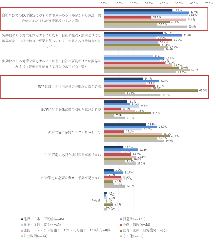 【図表A-7】業種ごとの今回調査時点のBCPに対する課題(n=507)]