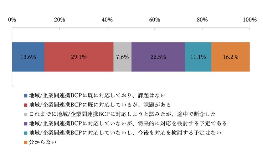 ◆地域/企業間連携BCPを策定済みと回答した企業は約4割を占め、将来的な対応検討を含めると2/3弱が何らかの対応を既に検討していると言える。一方で、地域/企業間連携BCPを途中で断念した企業は一定数(7.6%)存在。【図表A-8】