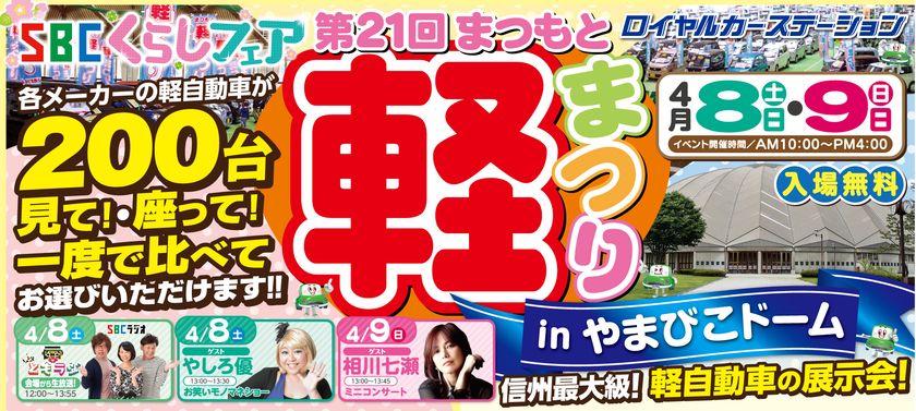 株式会社ロイヤルオートサービス(本社:長野県松本市 代表取締役:中田 忠章)は各メーカーの軽自動車が大集合する県内最大級の軽自動車の展示会「SBCくらしフェア 第21回まつもと軽まつり」を2023年4月8日(土)・9日(日)の2日間、信州スカイパーク やまびこドームにて開催します。