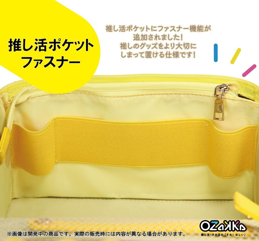 前面の「推し活ポケット」に厚みのあるグッズを入れた際、ポケットが内側に膨らんでしまいコスメ等が入れづらくなってしまうというお声がありました。その改善のため、ポケット上部にファスナーをつけ、広がり・膨らみを軽減できるようにしました!ポケットの入り口を閉じることで大事なグッズを守れるようにもなっています。