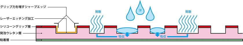 レーザーエッチング凹凸加工による発泡ウレタン素材とシャープエッジにより、汗を吸収し指先や手のひらの滑りを軽減。