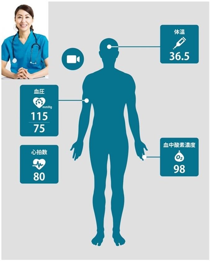 医師側:医師は、バイタルサインをもとに、患者とビデオ通話を通じて非接触で医療行為を実施できます。
