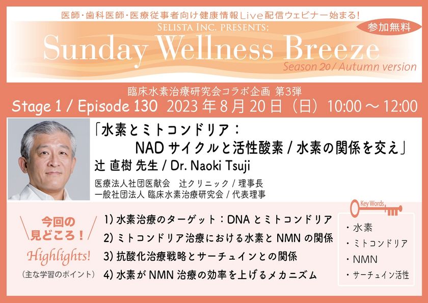 セリスタ株式会社(東京都千代田区、代表取締役:伊藤 承正)は、2023年8月20日(日)に、水素治療の研究と臨床における第一人者の辻 直樹 先生(医療法人社団医献会 辻クリニック/理事長、一般社団法人 臨床水素治療研究会/代表理事)を講師に迎え、医師・歯科医師・薬剤師・医療従事者限定の無料Zoomオンラインセミナー『水素とミトコンドリア:NADサイクルと活性酸素/水素の関係を交え』を開催します。