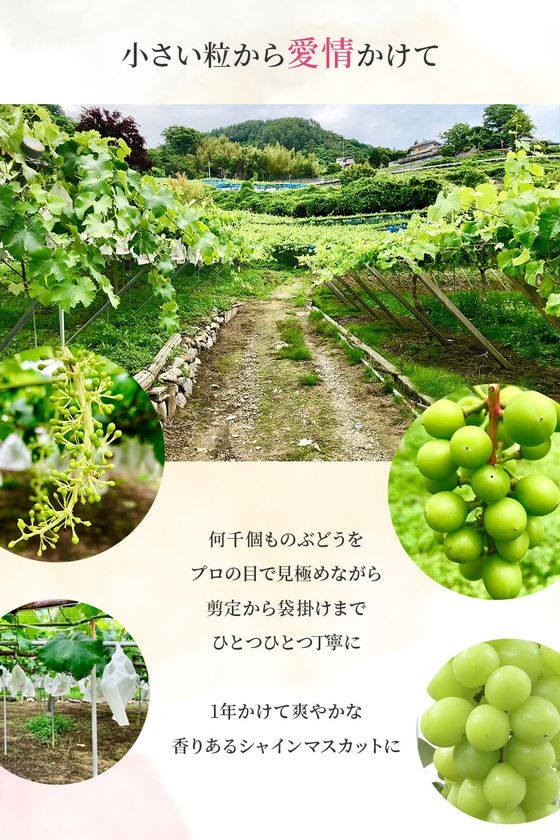 果物を育てるのに適した山梨県という環境下で太陽の日差しをいっぱい浴びて、小さな粒から愛情をたくさん注ぎ、育て上げたシャインマスカット。プロの目で日々しっかり見極めながら、「美味しくなるように」とひたむきに向き合い、剪定から袋掛けまで一年かけて育てました。