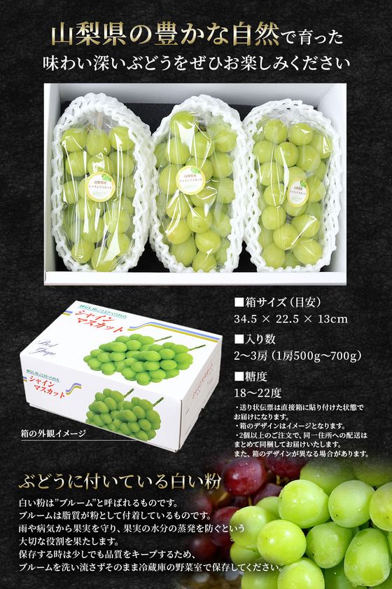 採れたての山梨産シャインマスカットをそのまま箱詰めして産地直送でお客様へお届けいたします。種なしになりますので食べやすく、甘み・酸味の絶妙なバランスに仕上がっております。
