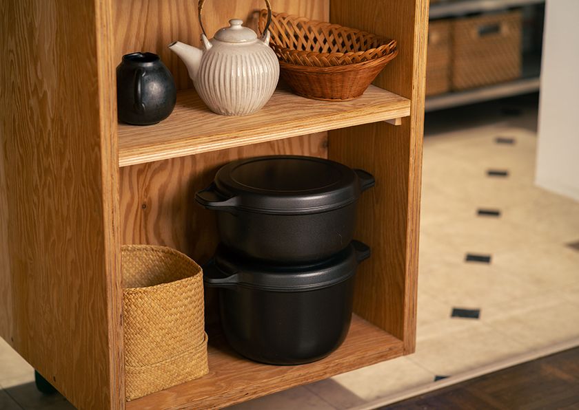 味わい鍋の特長は、肉厚の鋳物鍋ならではの高い蓄熱性、アルミならではの熱伝導のよさ、昔ながらの羽釜に着想を得た丸みのある形です。そのため、煮物や揚げ物はもちろんのこと、ごはんもムラなくふっくら炊き上げることができるうえ、フタの重みによって、素材のおいしさをぎゅっと閉じ込めた無水調理も可能。さらに、内側のフッ素樹脂加工のおかげでこびりつきにくくお手入れが簡単なので、特別な日も、そうでない日も、「毎日つかう鍋」として、長く愛されてきました。