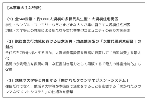 本事業は、ファミリー向けの分譲マンション228戸、少人数世帯向けのコンパクト分譲マンション82戸、ファミリー向けの戸建住宅125区画、学生・社会人寮114室による全549世帯・約1,600人規模の街づくりです。京都議定書誕生の地・京都における脱炭素先行地域のシンボル事業として、ZEH仕様を街区内のすべての住宅に採用する等の「省エネ化」、太陽光発電設備等による「自家消費の最大化」、昼間の余剰電力を夜間の再エネ証書付き電力として再販するエネルギーマネジメントシステムによる「電力の地産地消化」により街区内のエネルギー収支ゼロとすることを追求します。