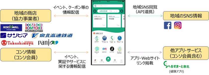 スマートシティに関するサービスに加え、地域の企業や団体が提供する情報やサービスを連携し、生活者一人ひとりの興味関心、ヘルスケア志向に見合った情報やサービスを提供できる総合ポータルアプリです。