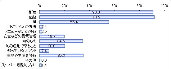 ■スーパーで青果(野菜など)を購入する際に「青果売場で確かめること」は、「旬」より「価格」・「鮮度」