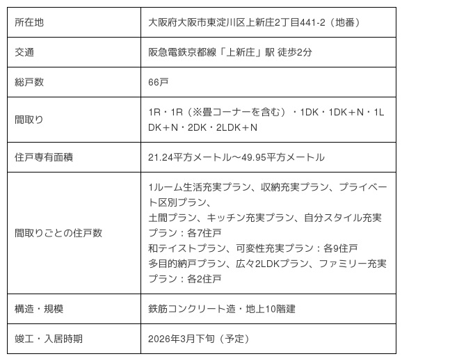阪急阪神不動産株式会社は、7月1日(月)、大阪市東淀川区において、一人ひとりのライフスタイルに合った間取りを提供する賃貸マンション「ジオエント上新庄」(以下、本物件)の新築工事に着手しました。今回、1K〜2LDK+Nまでの多種多様な間取りを設定することで、単身世帯からファミリー層まで、さまざまな人に住み継いでいただける住まいを提案します。