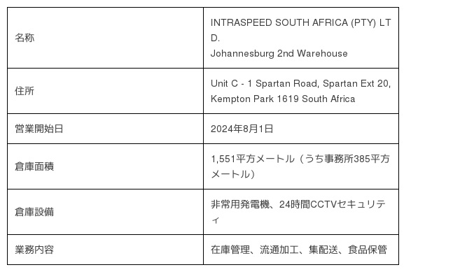 阪急阪神エクスプレス(本社:大阪市北区 代表取締役社長:谷村 和宏)の南アフリカ法人であるINTRASPEED SOUTH AFRICA (PTY) LTD.(本社:ヨハネスブルグ、以下、Intraspeed社)は、南アフリカ北東部のヨハネスブルグ市に新たに倉庫を開設し、8月1日より営業を開始します。