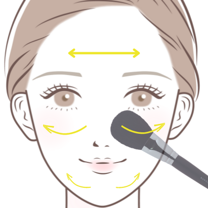 顔全体にパウダーをのせるためのブラシです。ブラシに適量のパウダーをとり、顔の中心から外側に向けてブラシをすべらせるように粉をのせていきます。最後は大きな円を描くようにフェイスラインをなぞります。