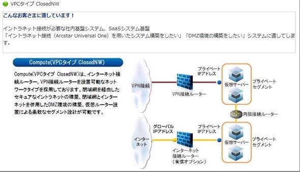 インターネットVPNとの接続が可能な「Compute(VPCタイプ OpenNW)」、Arcstar Universal Oneとの接続が可能な「Compute(VPCタイプ ClosedNW)」の利用により、お客さまは、用途に合わせて、セキュアなwebシステム、イントラシステムを即時構築し、利用することが可能です。(別紙1)