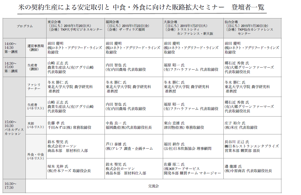 一般社団法人日本食農連携機構(本部:東京都千代田区、理事長:増田 陸奥夫)は、『米の契約生産による安定取引と、中食・外食に向けた販路拡大セミナー』を、2015年1月に全国4会場(東京・福岡・大阪・仙台)にて開催いたします。