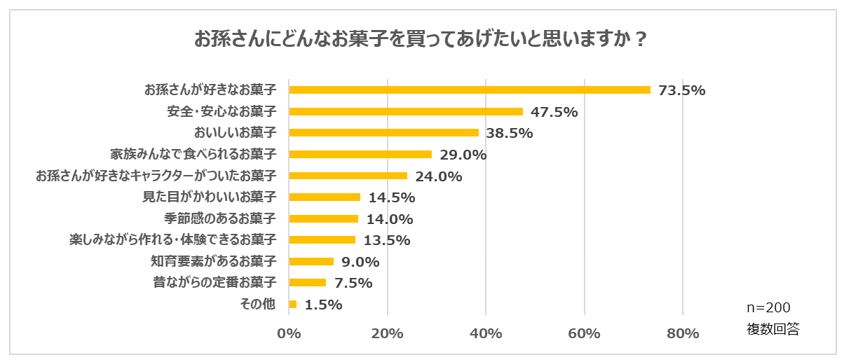 孫に買ってあげたいお菓子について尋ねたところ、最も多かった回答は「孫が好きなお菓子」(73.5%)でした。次いで「安全・安心なお菓子」(47.5%)、「おいしいお菓子」(38.5%)、「家族みんなで食べられるお菓子」(29.0%)が続き、祖父母は「孫が喜ぶかどうか」を第一に、おいしさや安心感も含めて総合的に選んでいることがうかがえます。