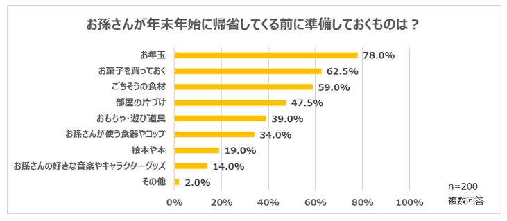 孫が年末年始に帰省してくる前に準備しておくものについて尋ねたところ、「お年玉」が78.0%、「お菓子」が62.5%、「ごちそうの食材」が59.0%でした。年末年始に祖父母がお菓子を準備して孫を迎える姿が浮かぶ結果となりました。