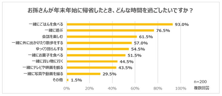 祖父母に対して、孫が年末年始に帰省したときにどんな時間を過ごしたいかを尋ねたところ、93.0%が「一緒にごはんを食べる」と回答し、51.5%が「一緒にお菓子を食べる」と回答しました。そのほか、「一緒に遊ぶ」(76.5%)、「会話を楽しむ」(61.5%)、「ゆっくり団らんする」(54.5%)など、日常の時間を一緒に過ごすことを重視する傾向がみられました。